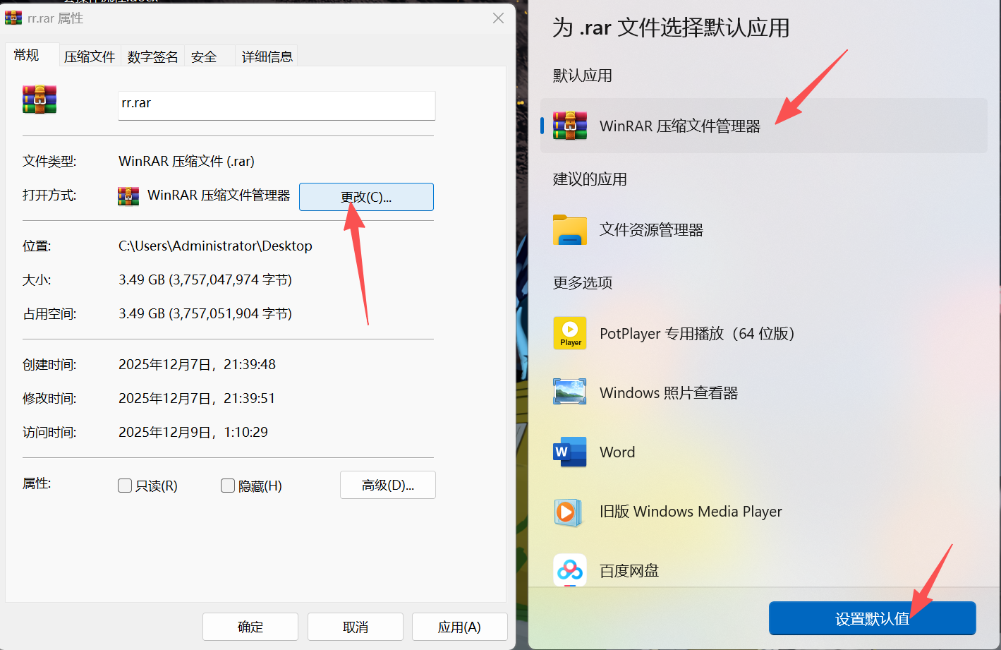 如还不能打开压缩文件,找到对应压缩文件,右键-属性-打开方式改为此软件
